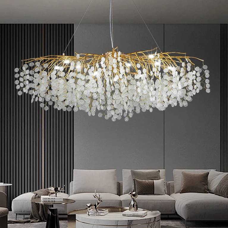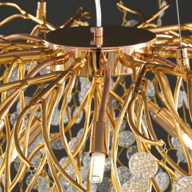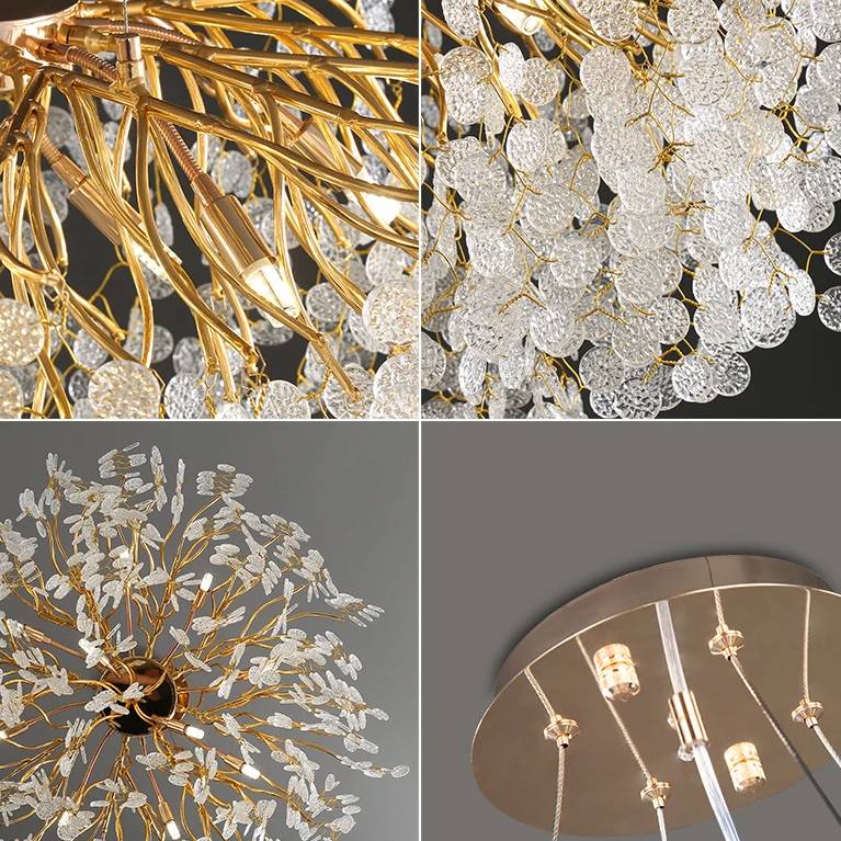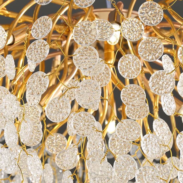 Notre grand lustre est doté d'un design parfaitement ressemblant aux branches d'un petit arbre : au bout des ramifications, un tissage de fil de fer est le cocon de nos jolies pastilles de verre opaque incrustées de doré qui tombent du lustre en grand nombre tout autour et en dessous . Elles reflètent la lumière des ampoules pour apporter une ambiance chaleureuse et douce. Ce lustre est grandiose.