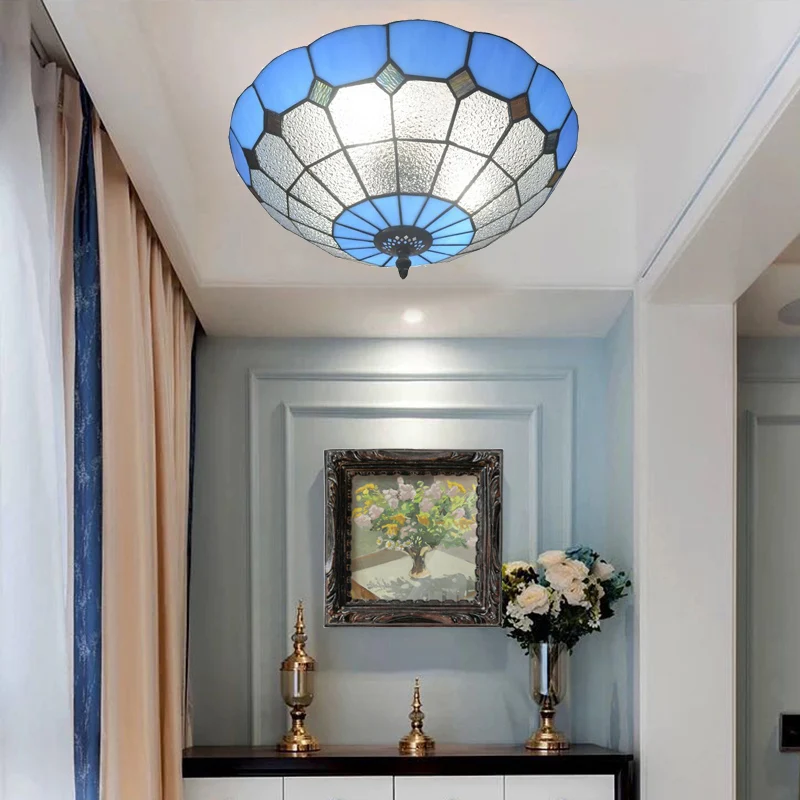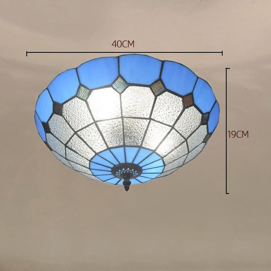 Inspiré par le design artistique et coloré de l'époque Art Déco, ce lustre est orné de magnifiques vitraux en verre coloré bleu et blanc. La lumière traversant le verre crée une ambiance chaleureuse et accueillante dans n'importe quelle pièce et éclair un surface de 15 à 30 mètres carrés. Il est disponible en deux tailles et en deux nuances de bleu.