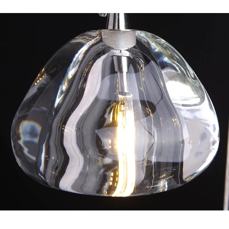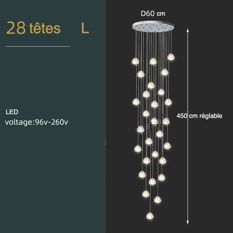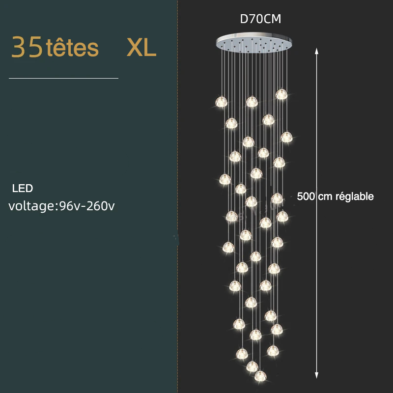Notre lustre escalier boules en cristal est un luminaire unique où des boules de forme indéterminée en cristal travaillé renferment chacune une ampoule LED : accrochées à des filins d'acier, à des hauteurs différentes, le résultat final donne un luminaire original très élégant, aérien, d'une grande pureté et à l'allure légère. La lumière qui émane de ces boules de verre fin apporte une ambiance chaleureuse et douce.