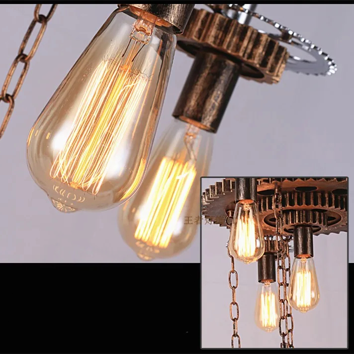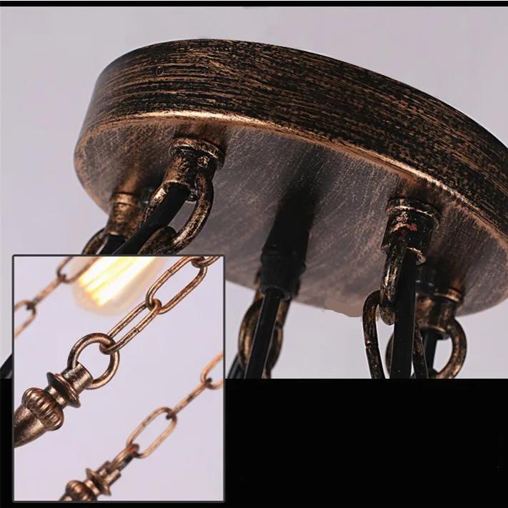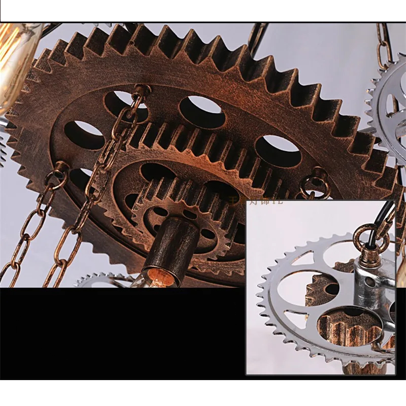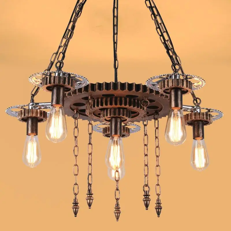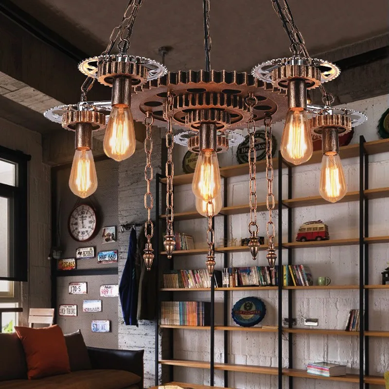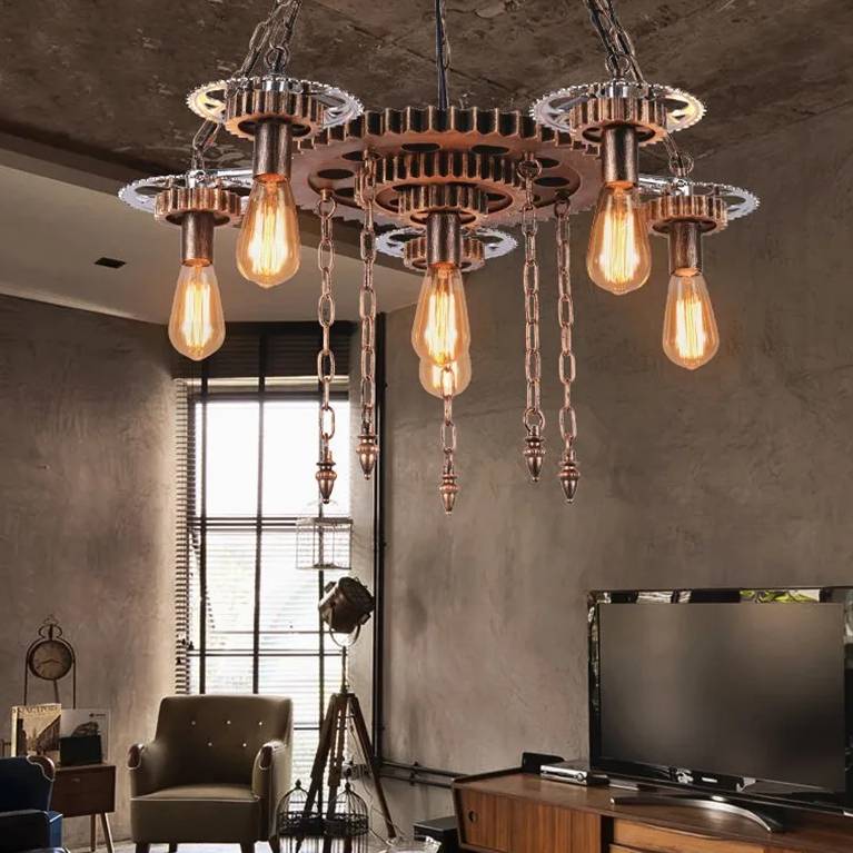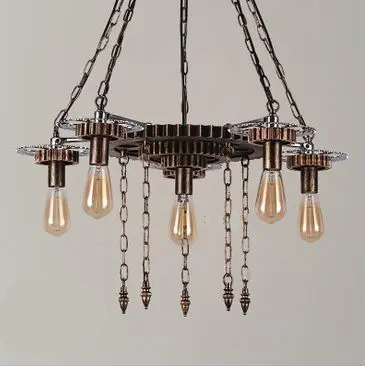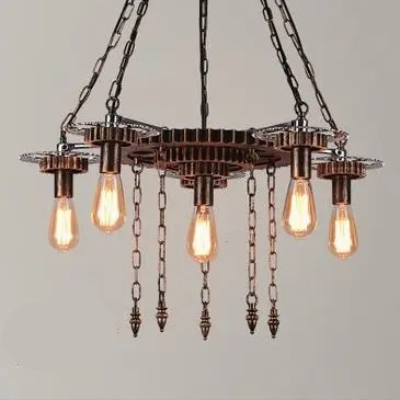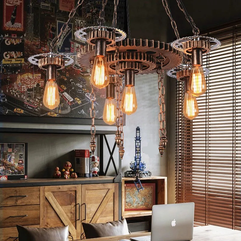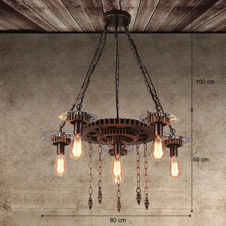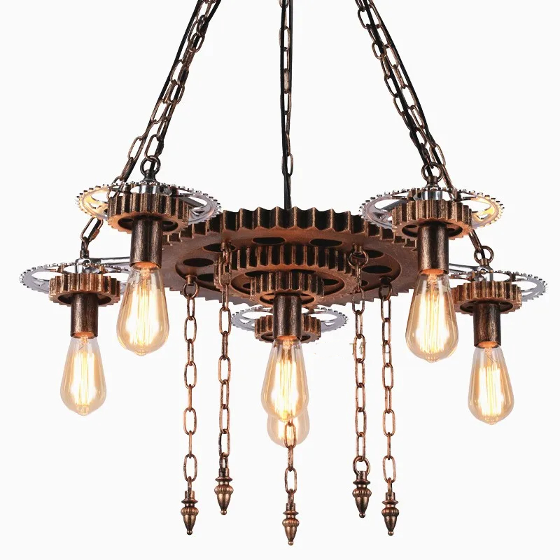 Ce lustre industriel fer forgé à six têtes ou plutôt six sources de lumière est un lustre très original, travaillé avec soin pour vous donner entière satisfaction. Plus qu'un luminaire fonctionnel au look unique, il est également un magnifique objet décoratif avec ses roues dentelées de différents diamètres et ses chaînes en bas qui finissent par de jolis glands et qui forment un ensemble cohérent très stylé.