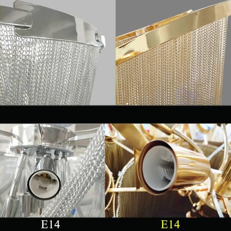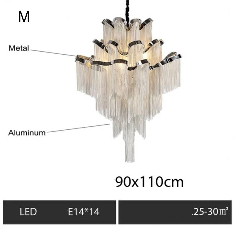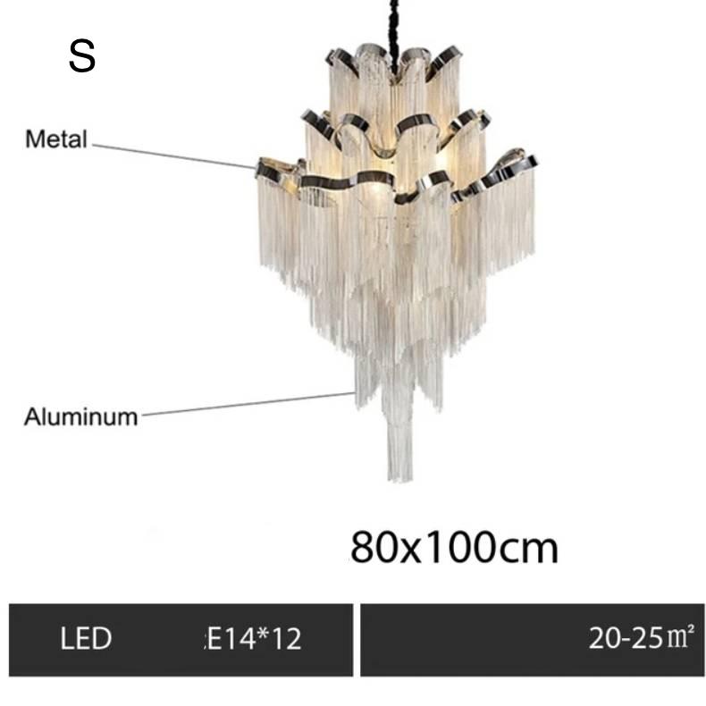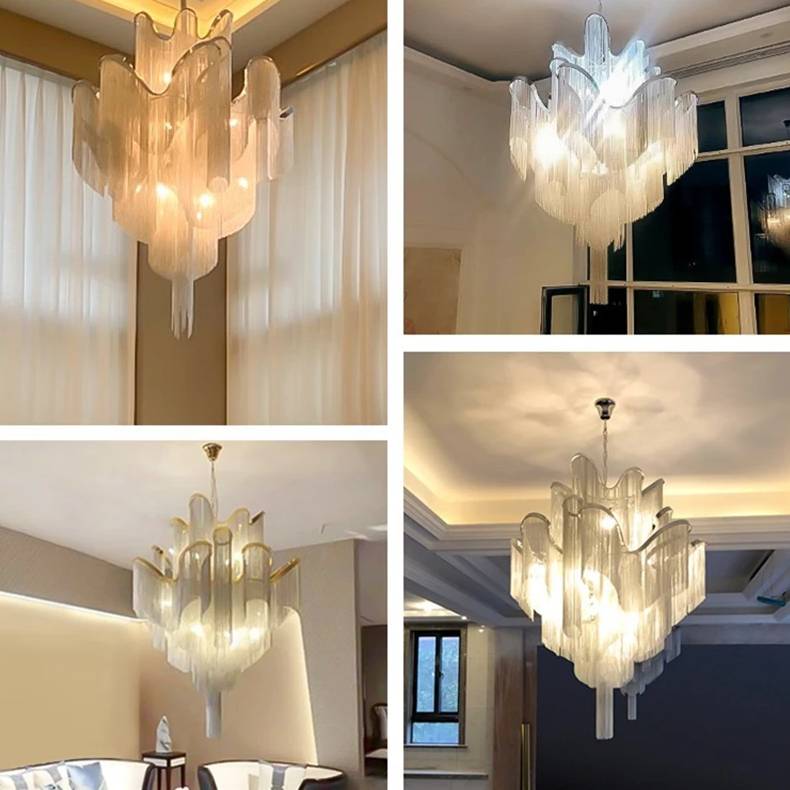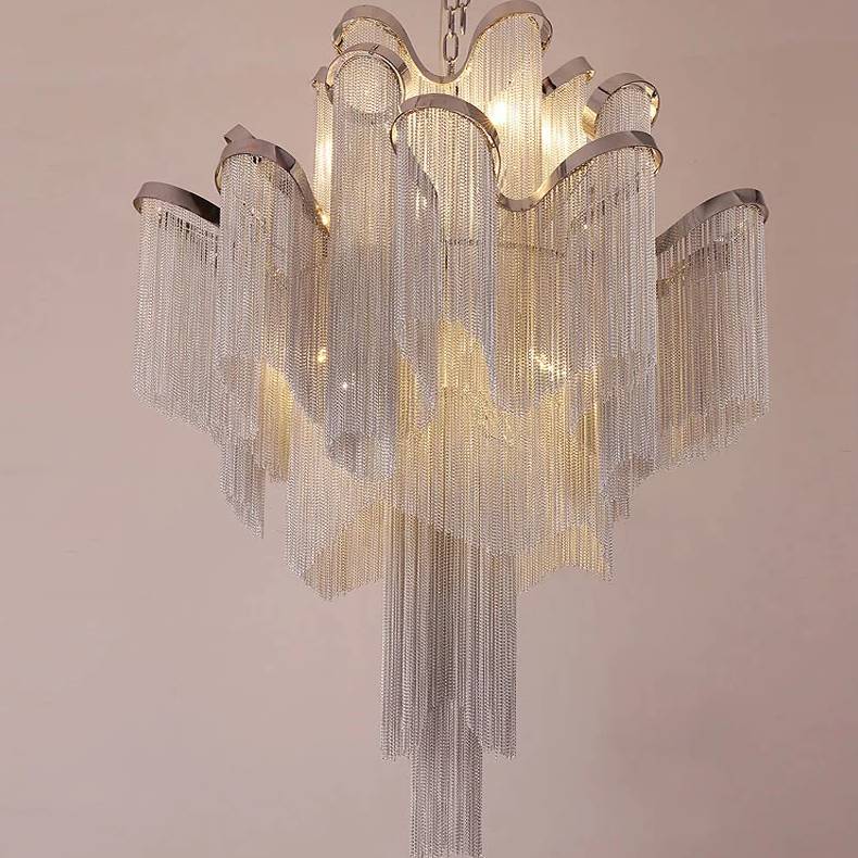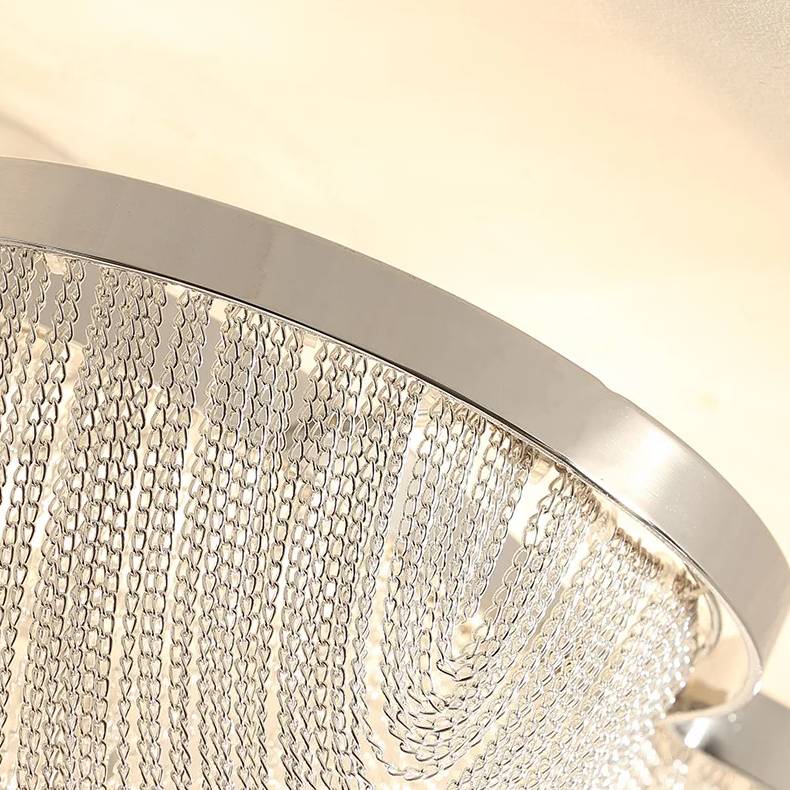 Notre lustre chaînes aluminium est une petite merveille de design, luxueux, au look fastueux qui rappelle les années 30 et le mouvement art déco. Il est cependant tout à fait contemporain et moderne avec ses chaînes savamment positionnées autour du cadre d'aluminium brillant aux courbes parfaites. C'est une oeuvre d'art à part entière en même temps qu'un luminaire de grande classe, fonctionnel et raffiné.