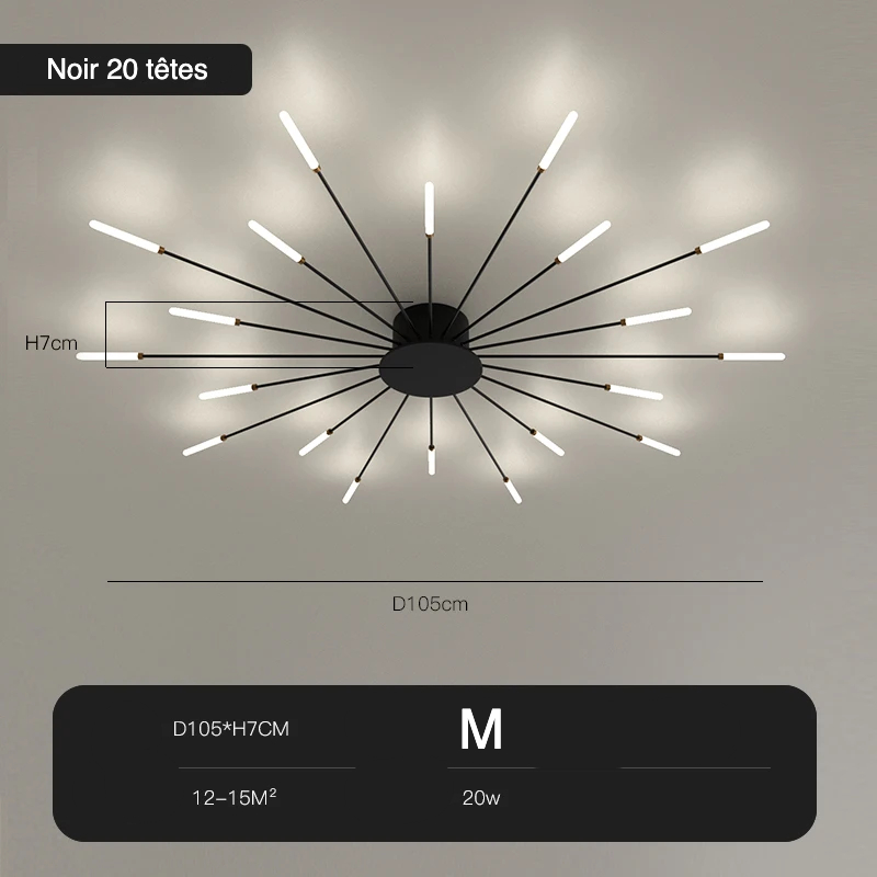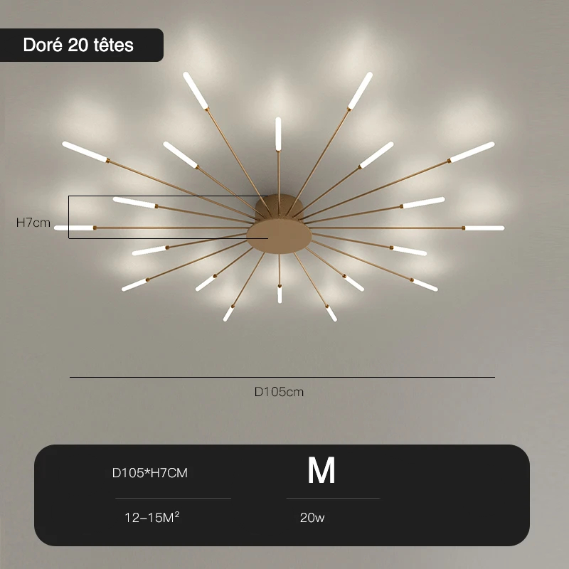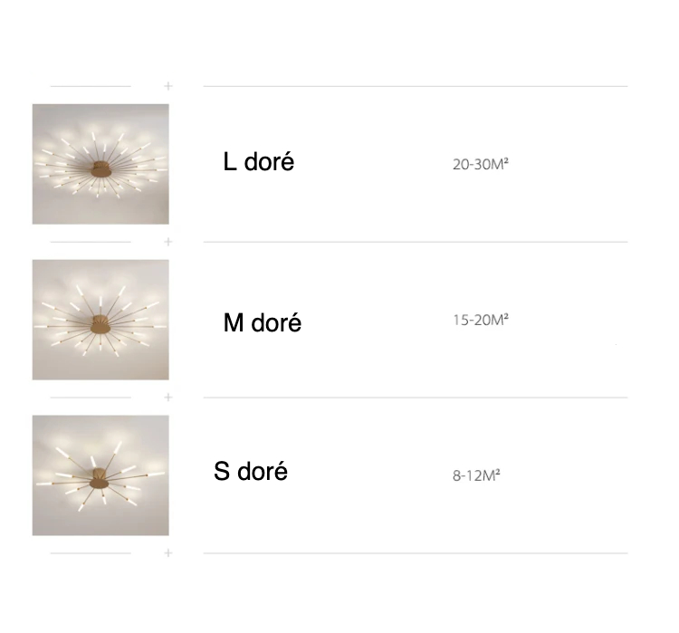 Ce lustre plafonnier étoile existe en deux couleurs, noir mat ou doré mat, teintes choisies pour leur délicatesse et leur look contemporain. Elles apportent de la sobriété au modèle et font ressortir les branches lumineuses comme des étoiles brillantes la nuit dans le ciel. Quelle que soit la taille de votre pièce, il y a un lustre pour lui convenir, et ce jusqu'à 30 mètres carrés.