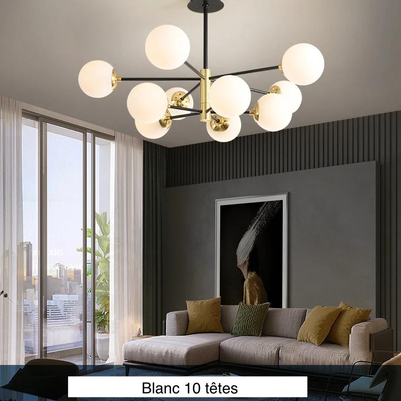 Ce lustre salon boules de verre est un luminaire assez original qui convient aux intérieurs modernes : il apporte une touche de douceur supplémentaire et de cocooning avec la rondeur des extrémités des tiges. Il offre également la possibilité de le placer dans une salle à manger ou un séjour pour une ambiance chaleureuse et douce.